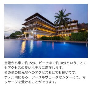 ※宿泊費、全クラス費、1日2回の食事、フルーツ、空港送迎、バックウォーター、寺院訪問、アーユルヴェーダドクターによる問診、アーユルヴェーダマッサージ、寺院での儀式が代金に含まれています。